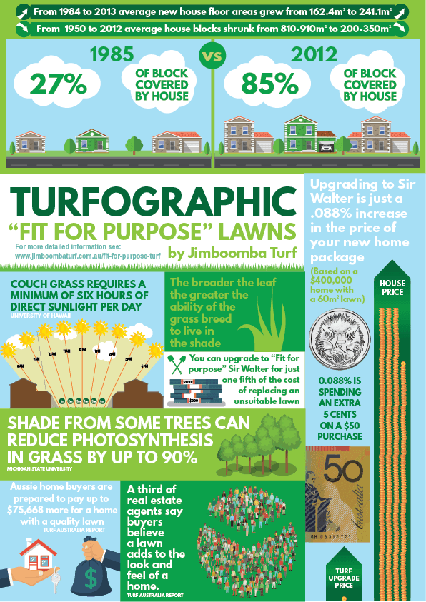 Data released by the Australian Bureau of Statistics show that the average percentage of residential block taken up by the house has grown from 27% in 1985 to 85% in 2012. This astronomical growth has put huge pressure on the unchanged grass varieties still used in modern backyards that aren’t fit for purpose for shaded lawns.
